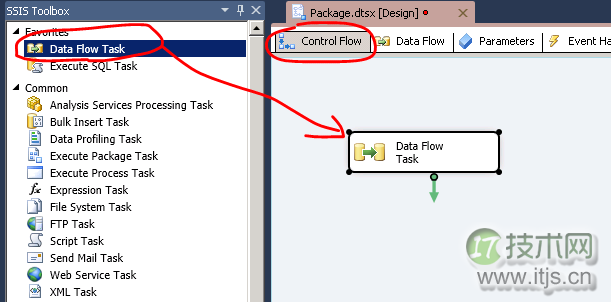 创建好工程后,在Control Flow这个Tab下拖入一个Data Flow Task,如下图: