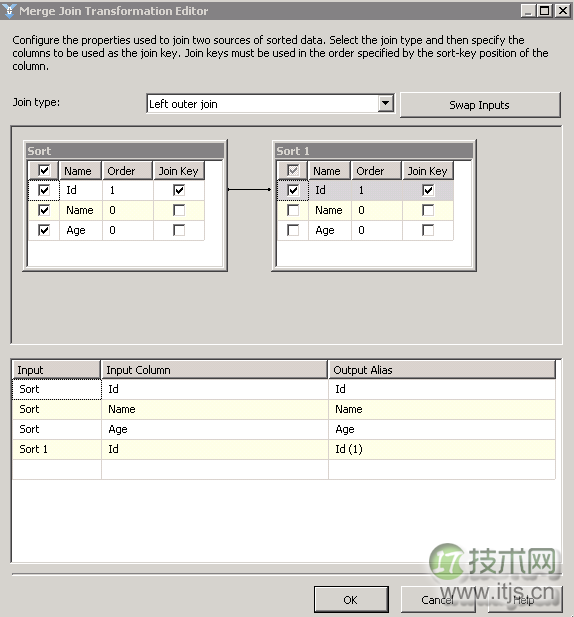 分别双击两个Sort,钩选表中的ID,对ID这个字段进行一次排序。因为Merge Join这个流程要求输入的数据是已排序好的。这个排序也可以直接在数据源中对它们的输出字段设置SortKeyPosition这个属性来排序。(详见:http://msdn.microsoft.com/zh-cn/library/ms137653.aspx)