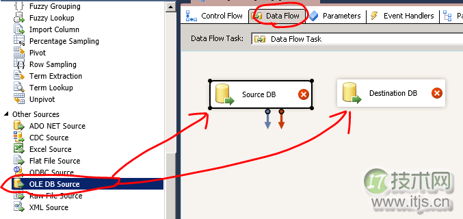 然后我们在左边工具栏里找到OLE DB Source,继续拖两个OLE DB Source出来。分别给它们命名为Source DB和Destination DB。