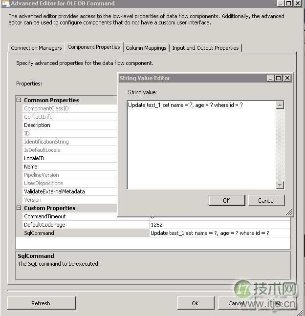 双击设置OLE DB Command,首先在Connection Managers这个Tab中选择好链接对象,然后在Component Properties这个选项卡中,设置你的SqlCommand属性。如下图: