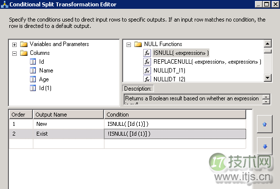 现在我们需要一个分支,即新的数据需要插入备份数据库中,而已有的数据需要更新为新的值。我们从工具栏中拖入一个Conditional Split来进行这样的分支处理。我们将Merge Sort中的输出指向Conditional Split,然后双击Conditional Split,如下图所示设置(注意条件一个是ISNULL,一个是非ISNULL)。